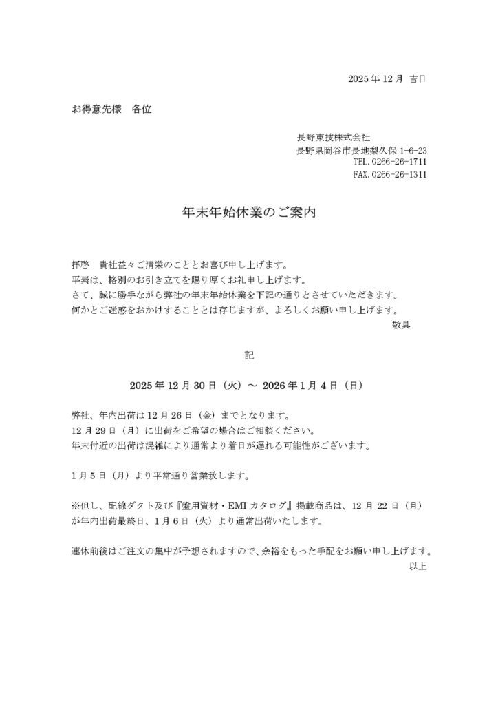 2025年12月30日(火)~2026年1月4日(日)まで年末年始休業となります。